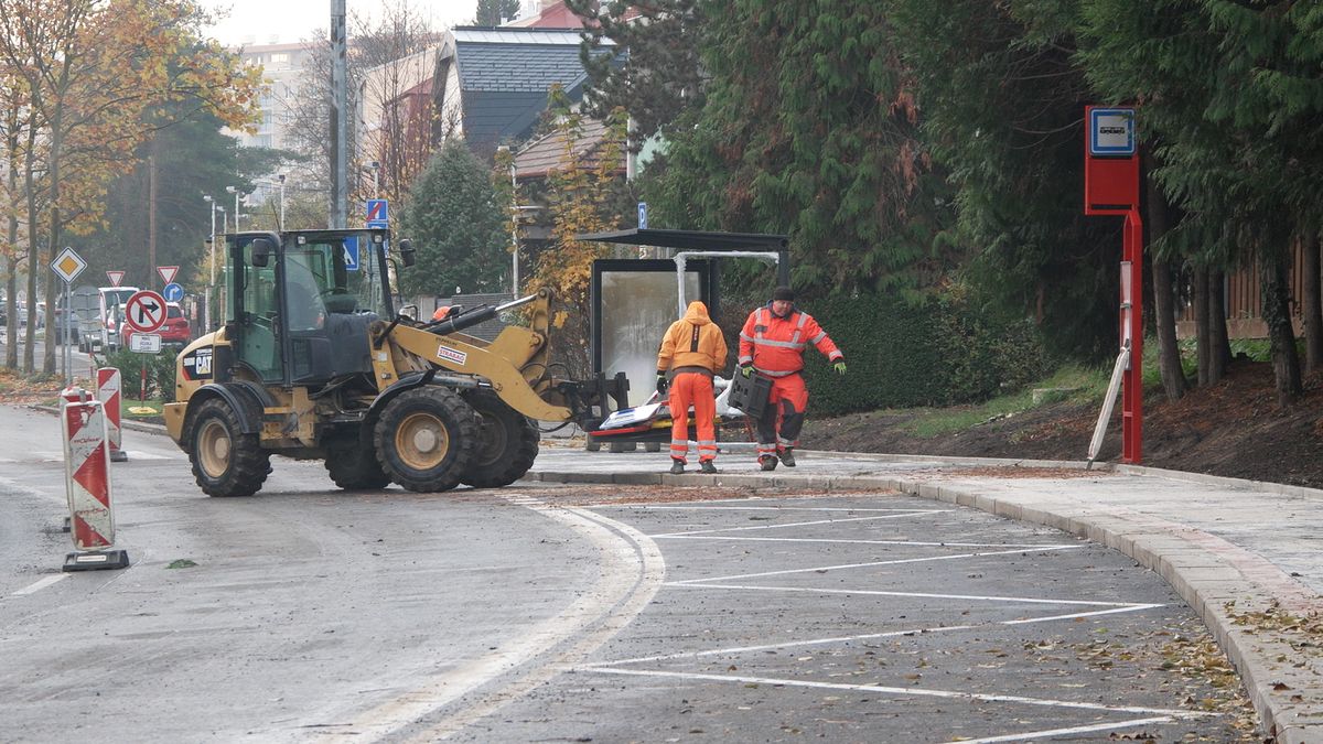 Dopoledne na místě pokračovalo rozebírání vozovky a její odvoz. Zároveň se připravovala pokládka nových obrubníků. Práce postupovaly a během dne již byly podél vozovky umisťovány první obrubníky.