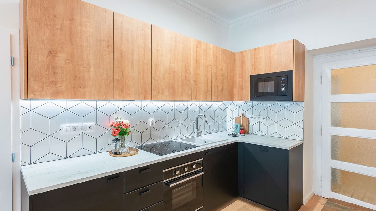 Pro horní police zvolili designéři dekor dřeva, spodní skříňky jsou v módní antracitové barvě. Spotřebiče jsou vestavné. Designérka i v tomto případě volila standardní výrobky z velkého nábytkového řetězce.