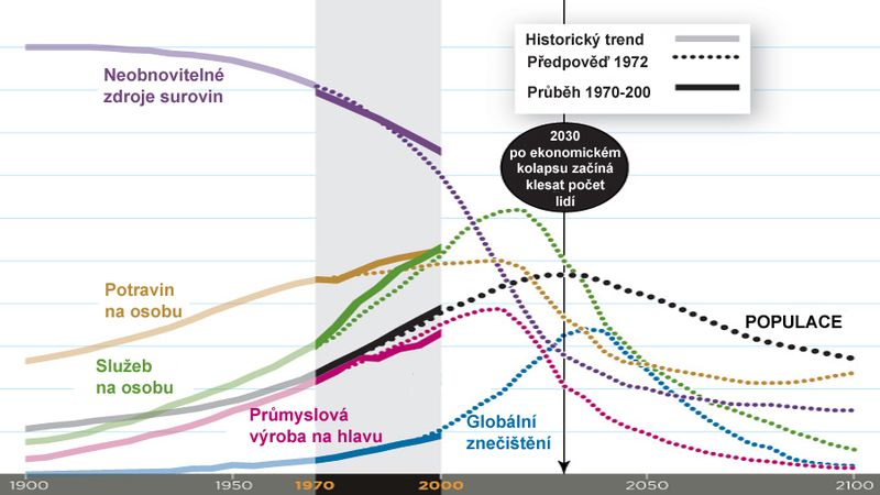 Navíc kritická fáze směřování k předpovězenému kolapsu v roce 2030 má nastat podle modelových křivek až v příštím desetiletí, kdy se má projevit obrácení dosavadních růstových trajektorií do poklesu ve všech sledovaných veličinách.