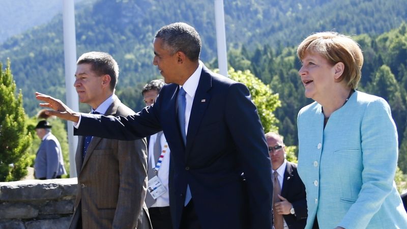 Německá kancléřka Angela Merkelová s manželem s americkým prezidentem Barackem Obamou před schůzkou G7