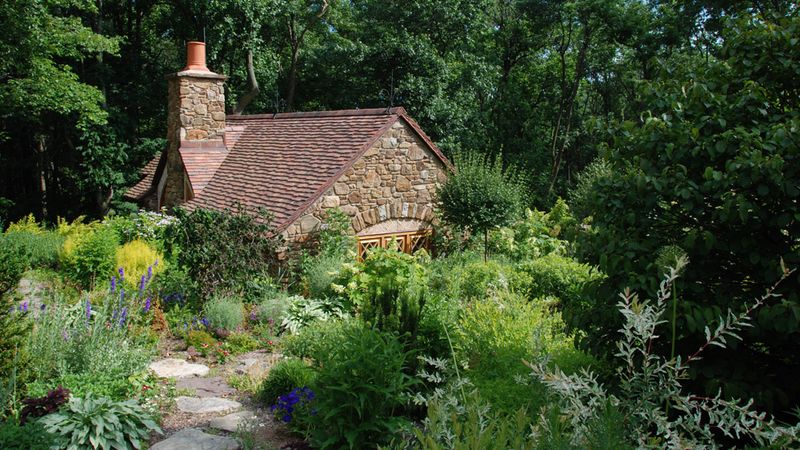 Domeček, který zcela zapadá do okolního prostředí, obklopuje malá zahrádka v anglickém stylu.