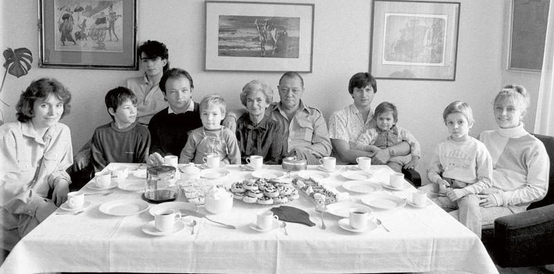 Klan Hrušínských pohromadě v roce 1988. Uprostřed Rudolf Hrušínský starší manželkou Evou. Dále Rudolf Hrušínský mladší (třetí zleva), Rudolf Hrušínský nejmladší (vestoje) a Jan Hrušínský (druhý zprava).