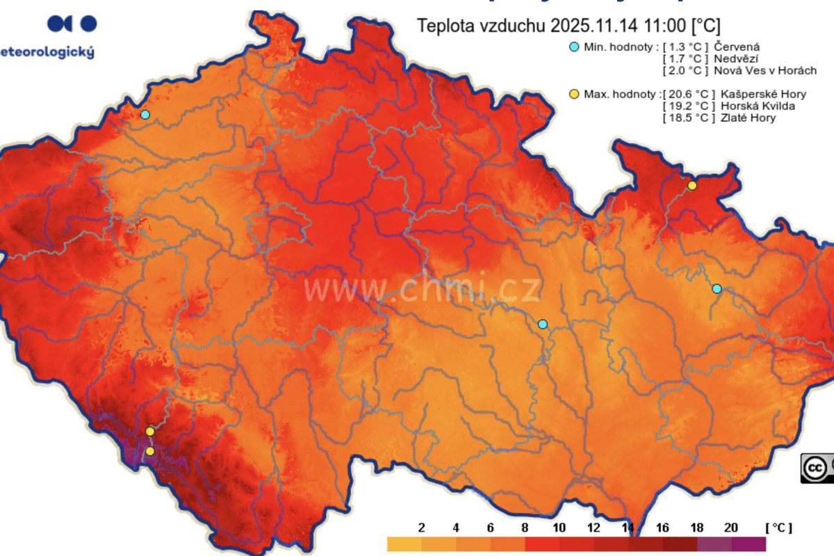 Stejně jako ve čtvrtek i v pátek vystoupaly teploty na Šumavě až k 20 °C a někde ji i překonaly. V Kašperských horách bylo už před polednem 21 °C.