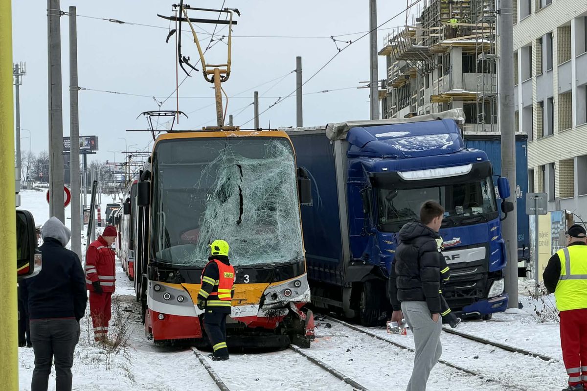 Zdemolovaný předek tramvaje a odhozený nákladní vůz na kolejích. Tak vypadala pondělní nehoda na pražském Barrandově, kvůli které je zastaven tramvajový provoz...