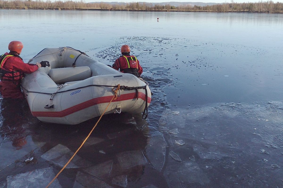 Pes uvízl na tenkém ledě. Denise z rybníka u Sokolova zachraňovali hasiči na člunu