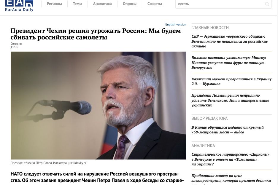Kremlem kontrolovaný server EurAsia Daily (EADaily) si ve středu dopoledne všiml varovných slov českého prezidenta Petra Pavla, který v úterý uvedl, že jednou...