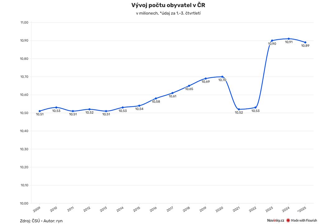 Počet obyvatel České republiky se za první tři čtvrtletí letošního roku snížil na 10 897 178. Oproti začátku roku žilo v ČR o 12 322 lidí méně. V pátek to...