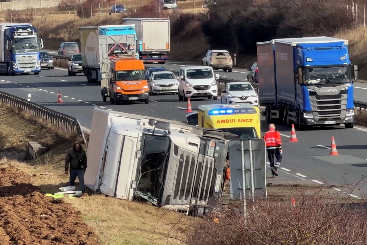 Havarovaný kamion ve čtvrtek odpoledne komplikoval dopravu na dálnici D5 na Berounsku. Vozidlo skončilo převrácené mimo vozovku. Řidiče měla v péči záchranka.