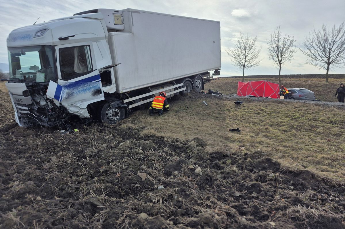 Tragická nehoda na Uherskohradišťsku: po srážce s náklaďákem zahynul šofér osobního auta