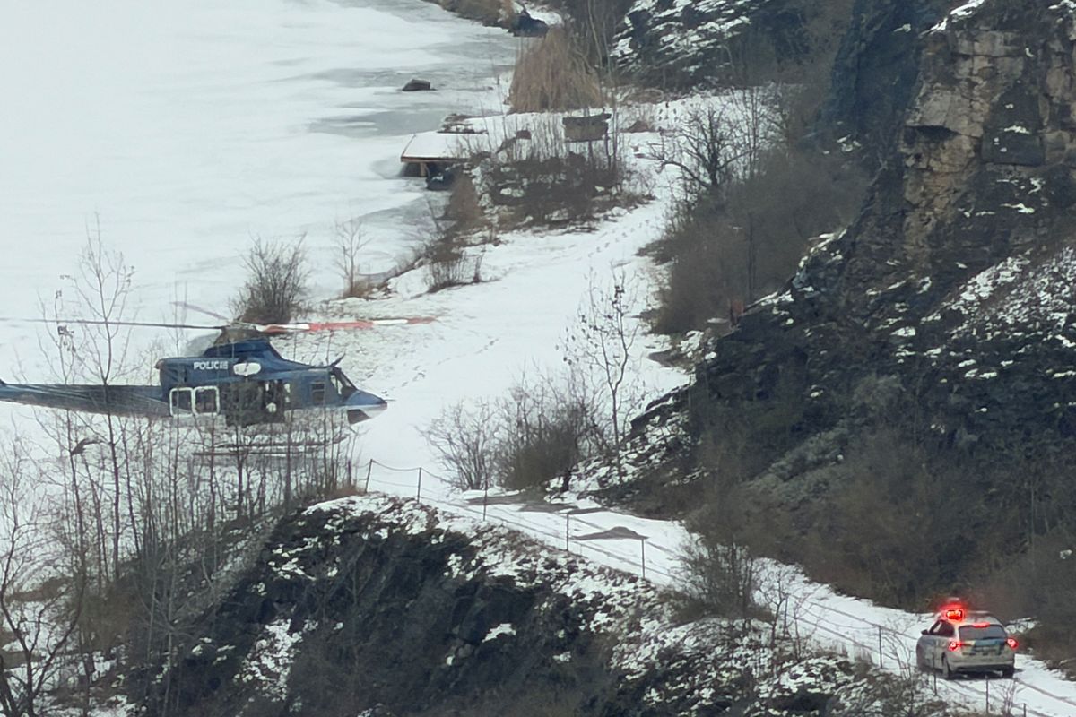 Záchranáři s policisty zasahují v bývalém lomu Velká Amerika na Berounsku, kde svědci našli mrtvého člověka. Tělo zůstalo zaklíněné v koruně stromu pod skálou.