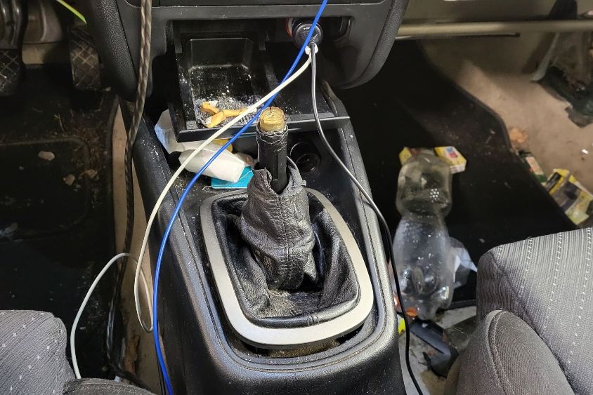 Pahýl místo řadicí páky, utržený výfuk, bez zrcátka. Vrak s platnou STK v Jindřichově Hradci měl 21 závad