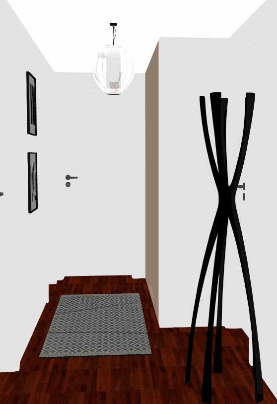 V předsíni byla navržena vestavěná skříň, také samostatně stojící věšák. Prostor je velmi malý, jsou v něm patery dveře, včetně vchodových.