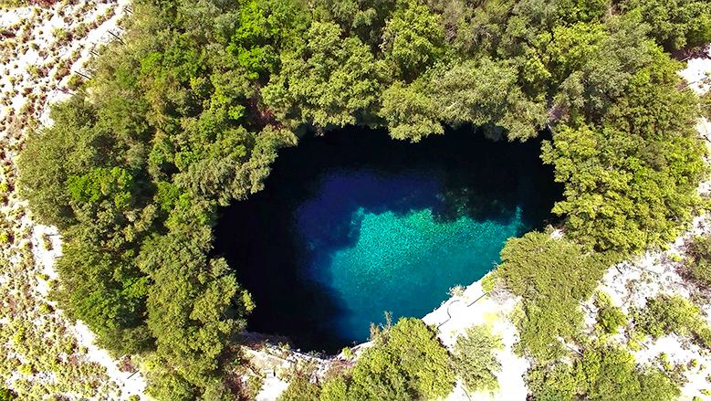 Letecký pohled na jeskyni Melissani, jejíž návštěvu byste si neměli nechat ujít v rámci pobytu na ostrově Kefalonie.
