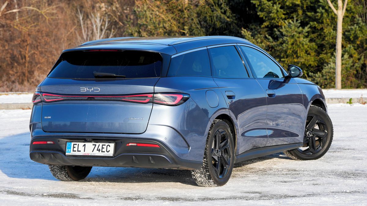 Na levém zadním boku je víčko palivové nádrže, pravý bok pak ukrývá dvířka nabíjecí zásuvky. Zadní světla jsou elegantně uhlazená a propojená osvětlenou linkou. Zadní nárazník zdobí náznak difuzoru, který se ale k rodinnému kombi příliš nehodí. Seal 6 ovšem může mít i tažné zařízení s kapacitou 750 kilogramů.