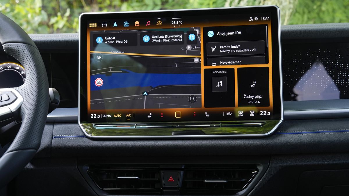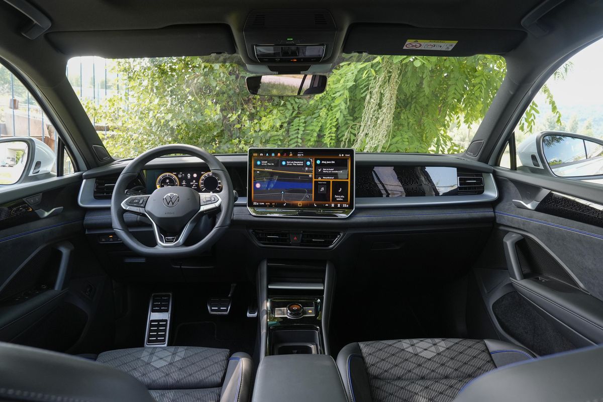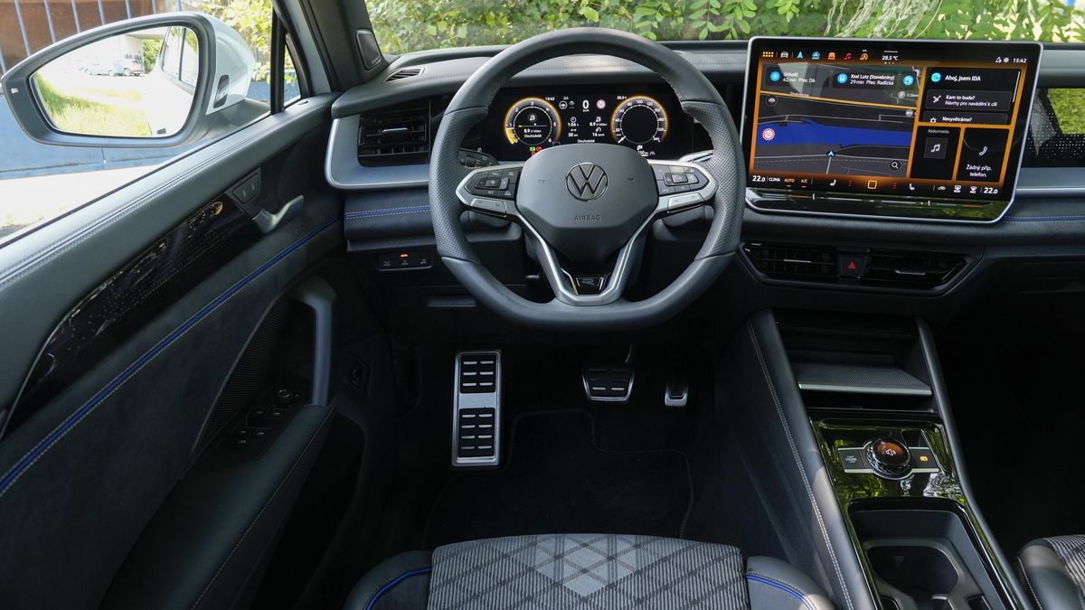 Zatímco exteriérem se snaží tayron odlišit, v kabině už vidíme povědomé prostředí, známé prakticky ze všech moderních vozů značky. Palubní desce dominuje vystouplá obrazovka infotainmentu, standardně s úhlopříčkou 12,9 palce, v našem případě příplatková verze s 15“ displejem.
