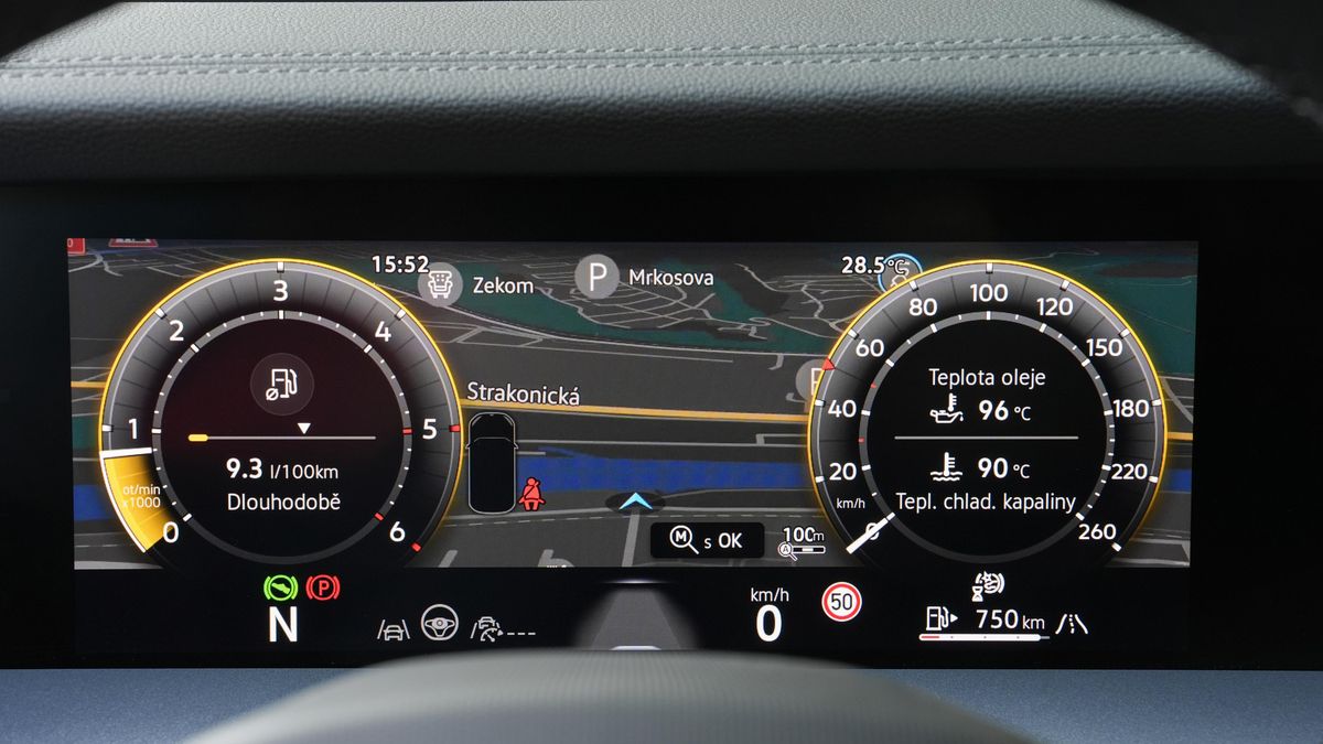 Před řidičem je 10,25“ displej přístrojového štítu, který doplňuje head-up displej promítající informace přímo do zorného pole. Volant potěší příjemnou sílou věnce i klasickými tlačítky, jinak je ovládání vozu řešeno především přes displej infotainmentu s líbivou grafikou a svižným chodem, který doplňuje otočný volič ve středové konzole.