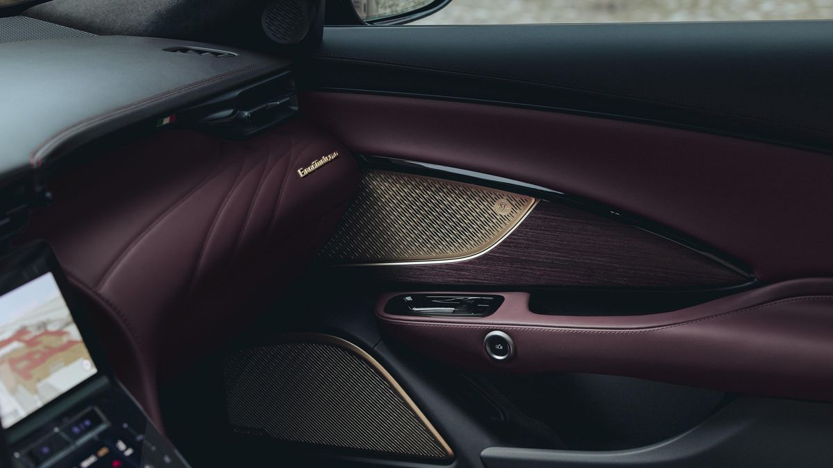 Interiér kombinuje vínově červenou kůži s alcantarou, tmavě červeným prošíváním, zlatými chromovými akcenty a vložkami z červeně lakovaného topolového dřeva. Součástí je plaketa „Creata a Modena“ na panelu dveří řidiče.