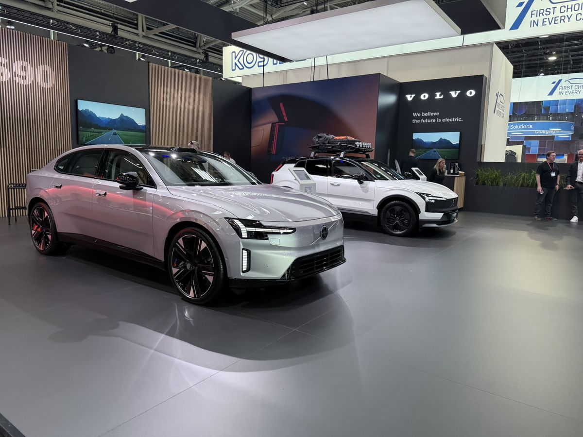 Stánek značky Volvo s modely ES90 a konceptem EX30 Cross Country