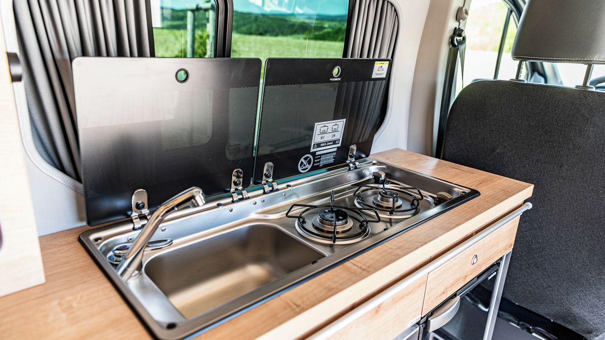 Po levé straně pak vidíme kompaktní vestavbu, do které byla integrována kuchyňka s plynovým vařičem, dřez na nádobí nebo kompresorová lednice o objemu 42 litrů. Po celém voze jsou navíc umístěny uzavíratelné skříňky a organizéry.