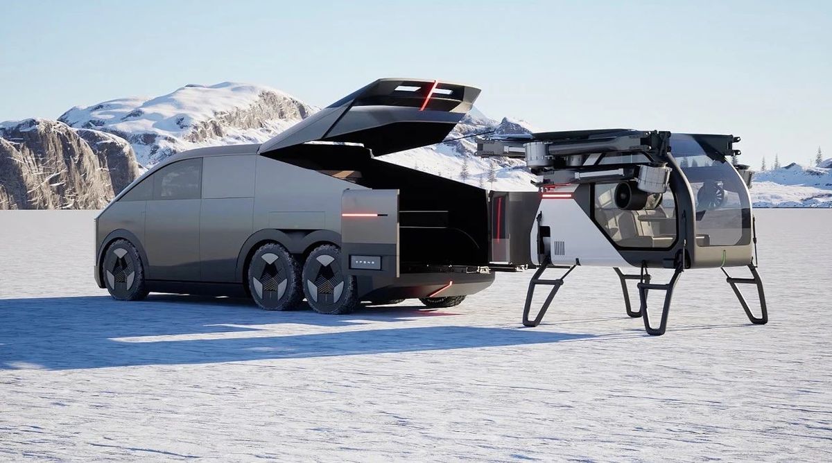 Ten je tvořen šestikolovým elektromobilem, připomínajícím pick-up s uzavřenou korbou, v jehož zadní části je nenápadně složeno dvoumístné „létající auto“ s šesti motory, jehož ramena umožňují složení do velmi kompaktních rozměrů.