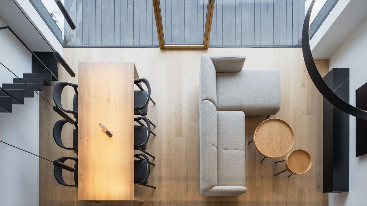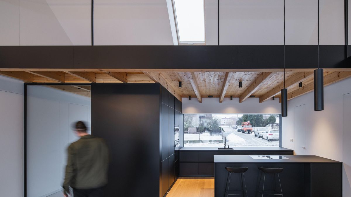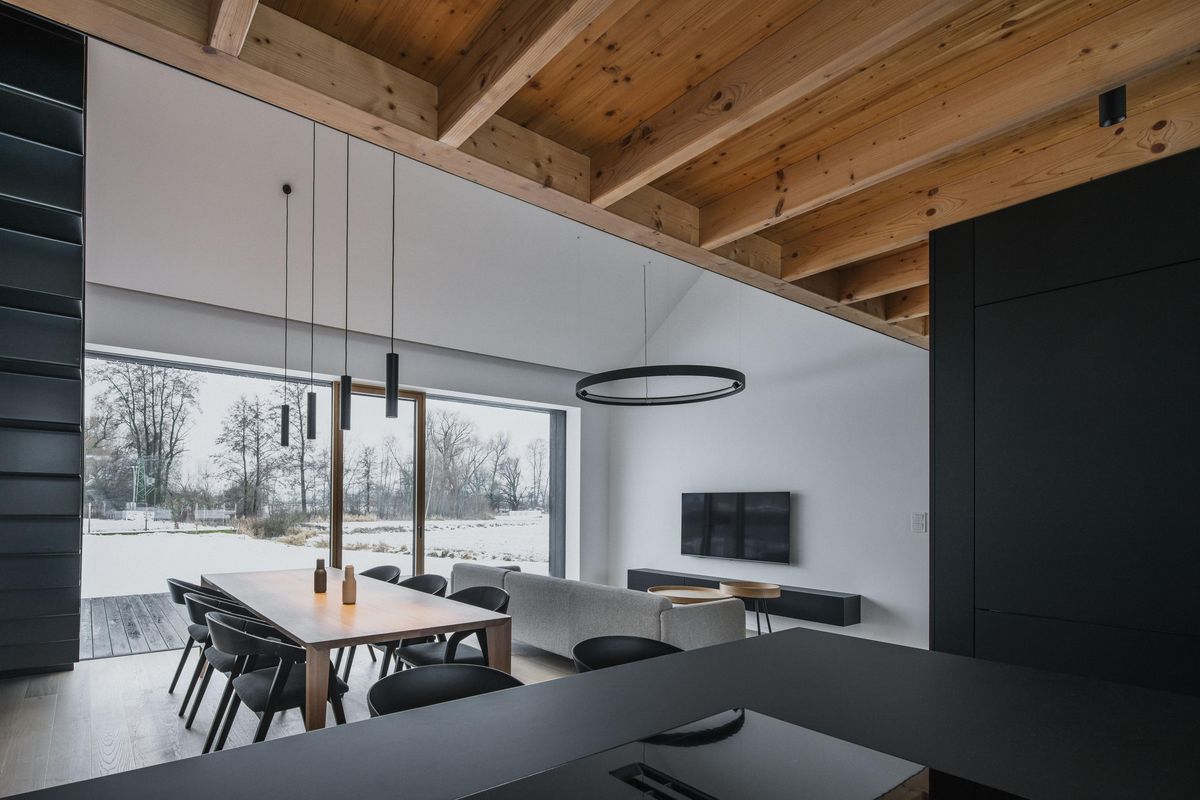 Nad celým obytným prostorem se otevírá vysoký strop se dřevěnými stropnicemi, díky nimž vynikne pochozí galerie nad kuchyňskou zónou. Z „ptačí“ perspektivy máte dokonalý přehled o dění v centrální části domu, kterému dominuje prostorný dřevěný stůl doplněný černými židlemi.