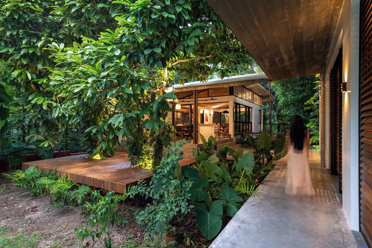 Málokoho asi překvapí i zdánlivý detail, na kterém si architekti rovněž dali záležet. Stavbu, která na pozemku zabírá 275 m2, totiž navrhli tak, aby kvůli ní nebylo na pozemku potřeba pokácet jediný strom. Naopak, svůj návrh domu přizpůsobili již stávajícímu porostu. Dva stromy cupuaçu (kakaovník velkokvětý, Theobroma grandiflorum) prorůstají terasou a staly se její přirozenou součástí. Na nádvoří zase dominuje vzrostlé avokádo, kvůli němuž musela být ve střeše vytvořena přesná mezera.