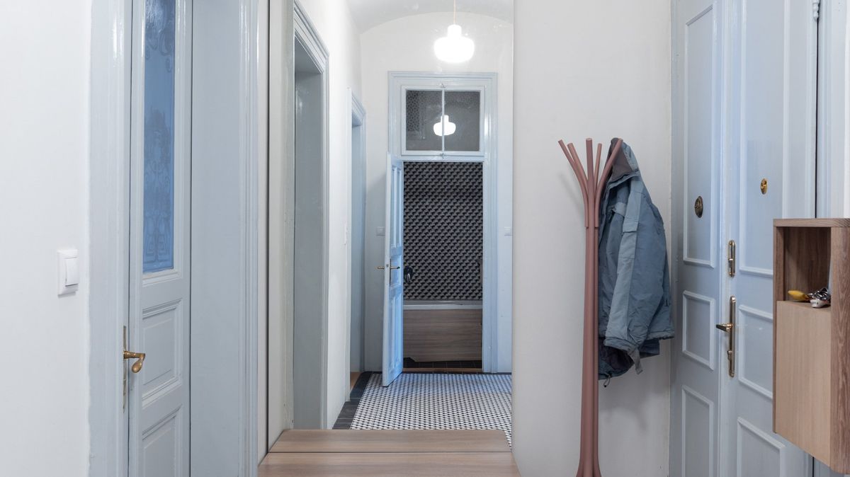 A tak architektky Hana Seho a Veronika Suchá z ateliéru R.U.A. do vstupní haly bytu vrátily dlažbu. Sice v novém designu, ale v původním charakteru kladení. Přibylo nejnutnější vybavení a velké zrcadlo. Krásné vysoké dvoukřídlé dveře do jednotlivých místností nechaly repasovat a jejich mosazné kování doplnit kopiemi původních dochovaných kusů.