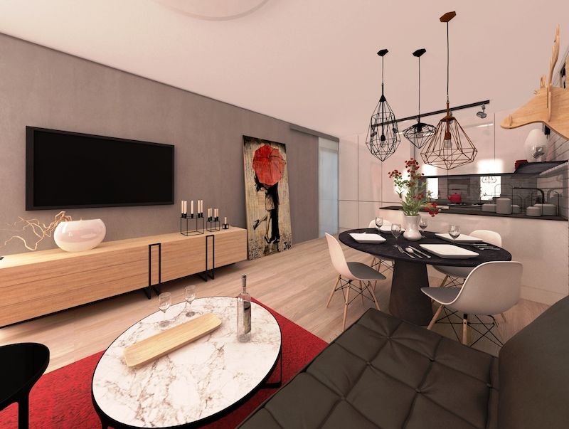 Obývací pokoj je spojený s kuchyní. Kuchyně je ve vstupní části obývacího pokoje. Protože zde není tolik světla, jednomyslná volba padla na dekor v bílé lesklé barvě, podtržený černou barvou na pracovní desce a soklu.