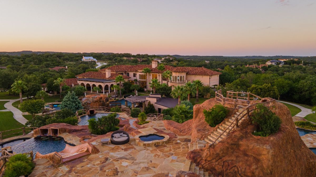 Největší pozornost však poutá venkovní část nemovitosti. Dominantou je rozsáhlý aquapark, který patří k největším svého druhu v soukromém vlastnictví. Nabízí několik tobogánů, bazény propojené vodními prvky, umělé jeskyně, vodopád i línou řeku. Celý koncept vznikl s cílem vytvořit prostor, kde mohou rodina a přátelé trávit čas bez nutnosti opouštět areál.