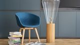 Koupelnový nábytek, oblý, modrý a v rastru, odkazuje na komodu v jídelně a nápaditě tak propojuje celý byt. Hra s obloukem se opakuje i v podobě nástěnného zrcadla, na které navazují decentní modré poličky. Vnější část koupelny je obestavěna nábytkem s bohatými úložnými prostory, což rodina s malými dětmi jednoznačně ocení. Je z bělené překližky a lze ho směle vnímat jako jeden z hlavních materiálových prvků interiéru.