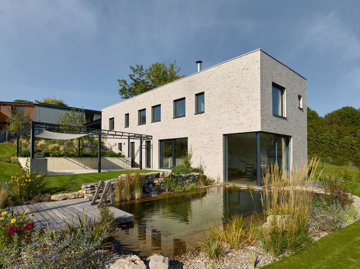Volba materiálů sjednocuje vzhled fasády a interiéru a zajišťuje jejich vzájemnou návaznost. Fasáda z pískových cihel dodává stavbě pevný, klidný výraz. Stejné světlé tóny architekti uplatnili i uvnitř domu – na podlahy, schodišťové stupně i vestavěný nábytek použili bělený dub.