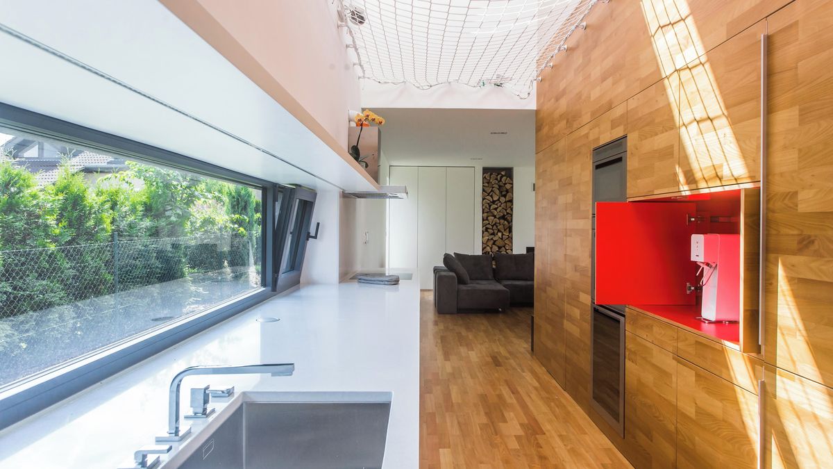 Z parket je vytvořena i spárovka, která rámuje prostor pro kuchyňskou vestavbu a zároveň ukrývá velkou komoru pod schodištěm. Po bocích centrálního bloku se místnost otevírá směrem do podkroví s využitím horizontální sítě nad kuchyní. Majitelé v ní můžou klidně i relaxovat.