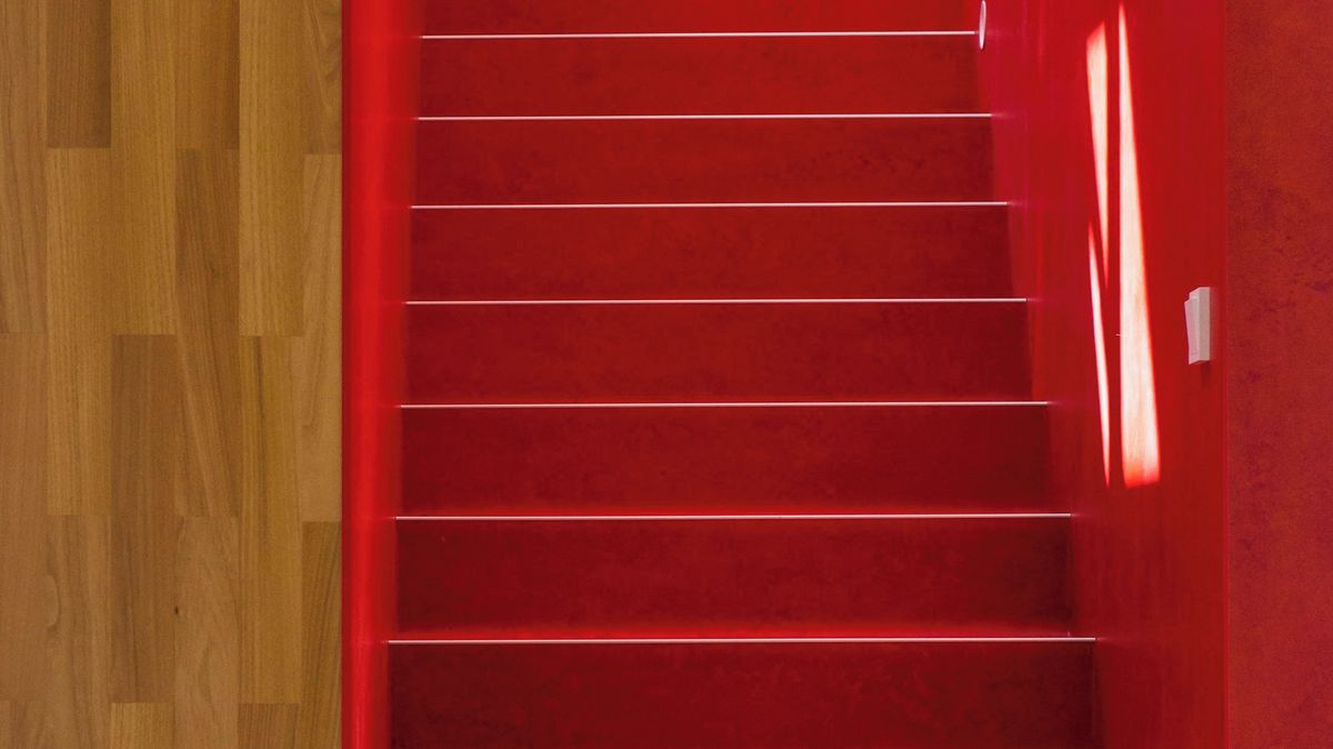Červená barva srdce se propisuje atypicky na schodiště i stěny po jeho stranách. A to v podobě červeného marmolea, což je obecný název pro ekologickou podlahovou krytinu.