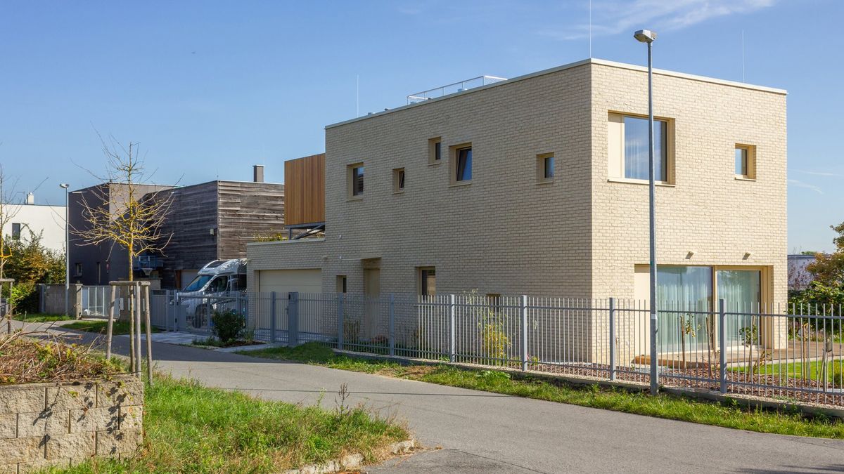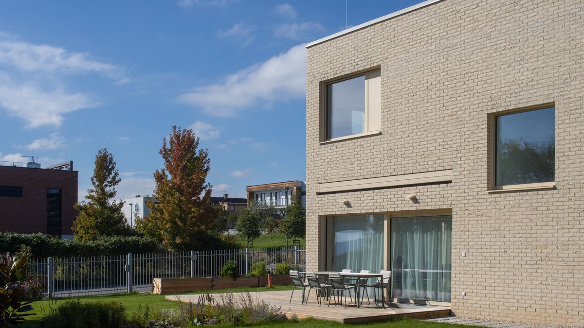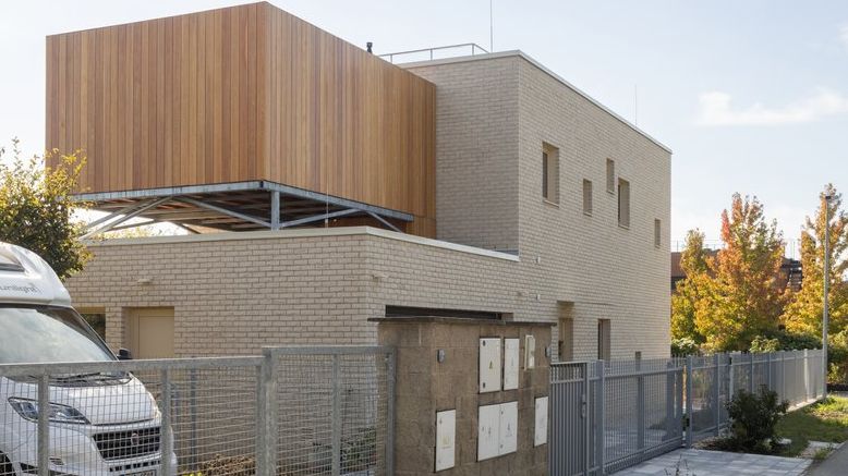 Fasáda domu je provětrávaná s předsazeným pohledovým lícovým zdivem. Reliéf světlého zdiva i modřínové opláštění sauny dodávají architektonickému výrazu domu jemnost a texturu.