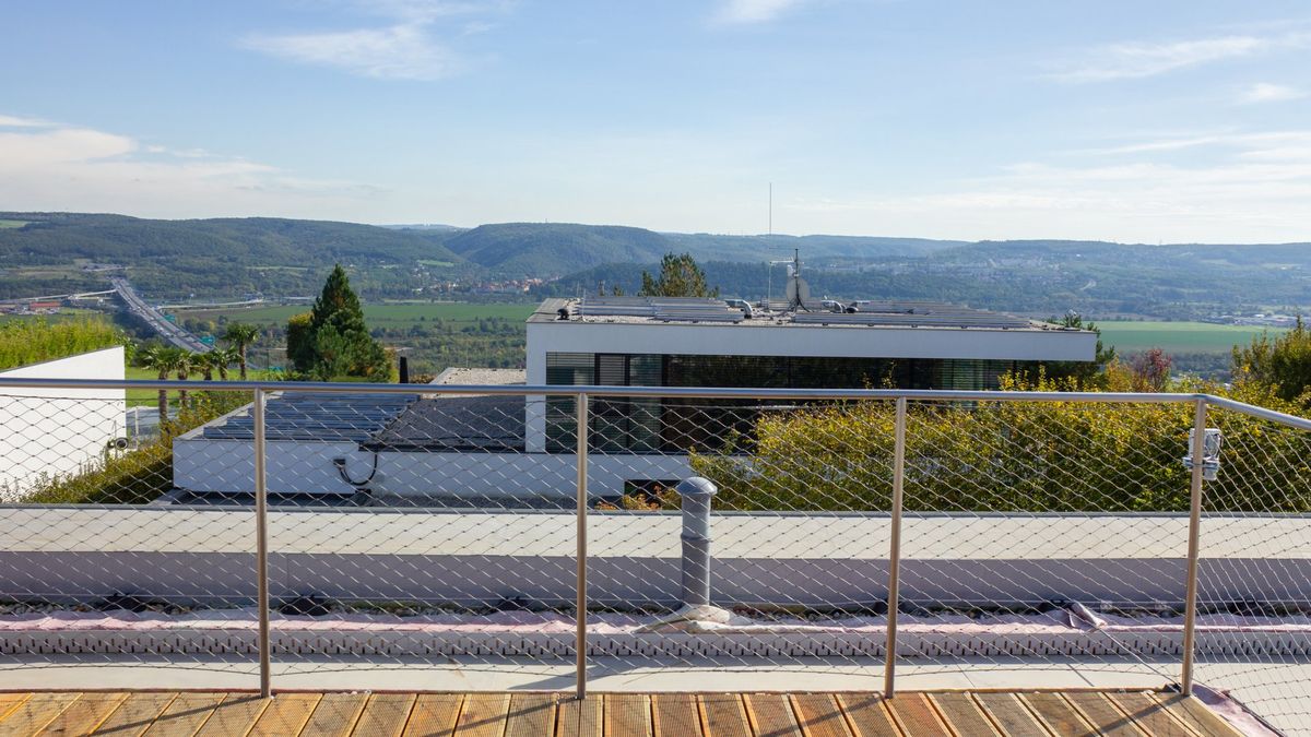 Odpočinkový prostor je venkovním schodištěm propojen s vyhlídkovou terasou na střeše domu. Z ní je možné se dívat do okolní přírody i se chvíli kochat na rozsvícenou pulsující Prahu.