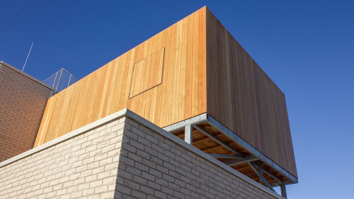 Z velké koupelny rodičů je přístupný venkovní relaxační prostor se saunou a venkovní sprchou. Tato odpočinková oáza je vymezena ocelovou nosnou konstrukcí posazenou na střeše garáže. Konstrukce je ve své spodní části přiznaná, v horní části je již zmíněné opláštění modřínovými prkny.