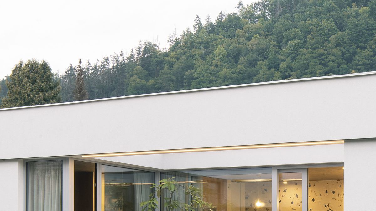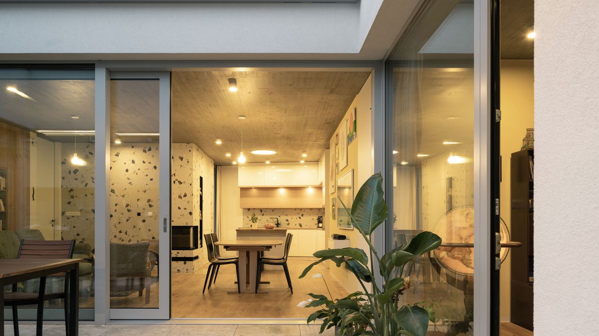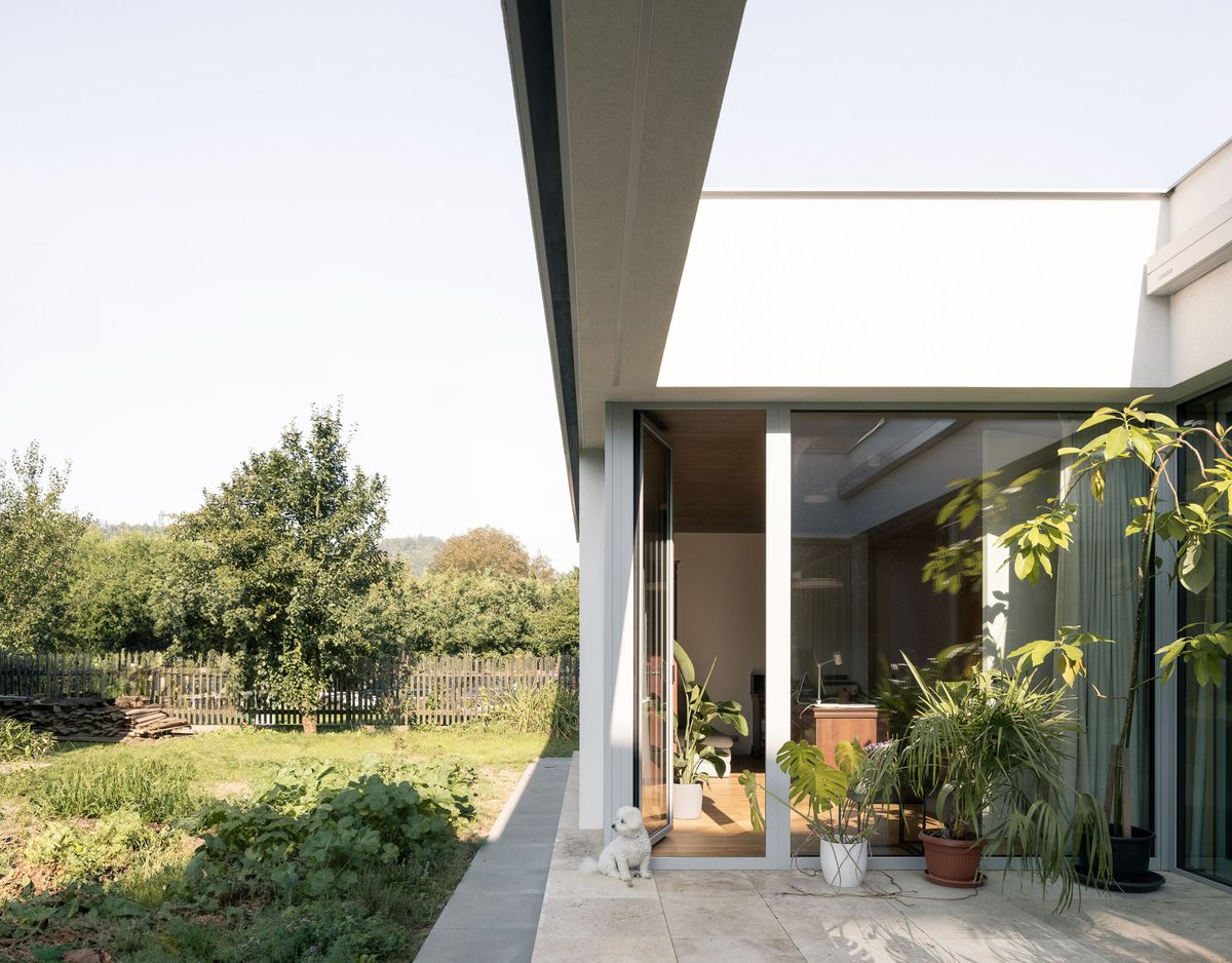 Posunutí atrií ze středu domu na jeho obvod dovoluje vpustit do domu ještě více světla, a přesto zachovat pro obyvatele intimitu. Atria slouží i jako zelený filtr, propojují exteriér s interiérem a přinášejí do domova svěží atmosféru přírody. Tato zelená oáza je hlavním motivem domu, který nabízí obyvatelům klidné a zároveň inspirativní prostředí. Zvláštní pozornost byla věnována umístění oken. Všechna jsou směřována právě do atrií. Tato orientace nejenže poskytuje maximální soukromí, ale také umožňuje výhledy do krajiny mimo okolní zástavbu. Atria jsou umístěna na každou stranu domu, přerušují plynulou stěnu a zachovávají tak jednotný charakter objektu ve všech úhlech pohledu.