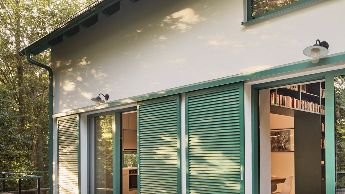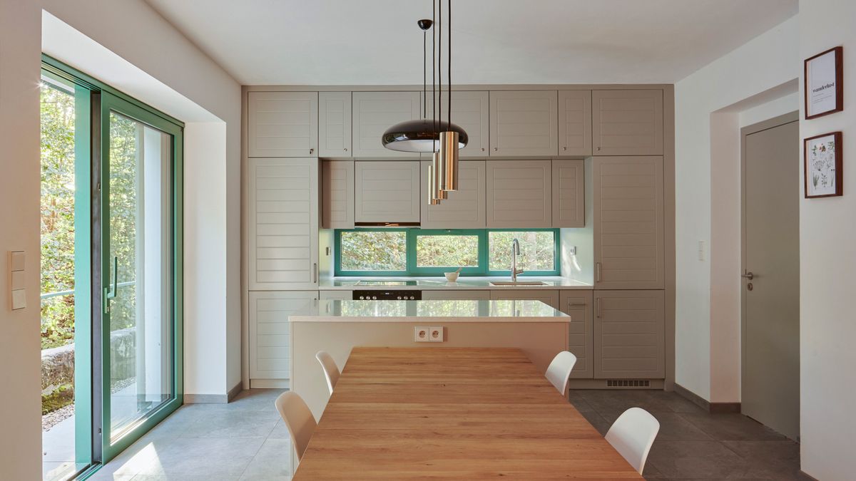 S obytným prostorem je úzce spojena kuchyň, do níž se prochází skrz velký otvor lemovaný knihovnou. Právě velká knihovna s úložnými prostory ve skříňkách a na ni navazující zábradlí na galerii a schodišti jsou místem, kde se opakuje barva okenic a detailů v exteriéru. Barevná kontinuita mezi vnějškem a vnitřkem sjednocuje dům a ukotvuje jej v krajině, aniž by se opírala o historizující tradice.