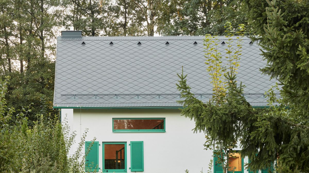 „Dům pracuje s kontrasty – tradiční forma a měřítko na jedné straně, současný interiér s odvážnými barevnými akcenty na straně druhé. Mechově zelená barva se stává prostředníkem mezi krajinou a interiérem, zatímco cihla evokuje stabilitu a hmotnost. Kombinace bílých a šedých ploch s přírodními materiály dodává interiéru klidný rytmus,“ popisují svůj záměr architekti.