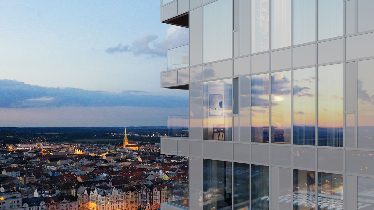 Klubové patro s bazénem a wellness ve 23., respektive 24. podlaží bude v černé barvě, aby vynikly výhledy na Plzeň.