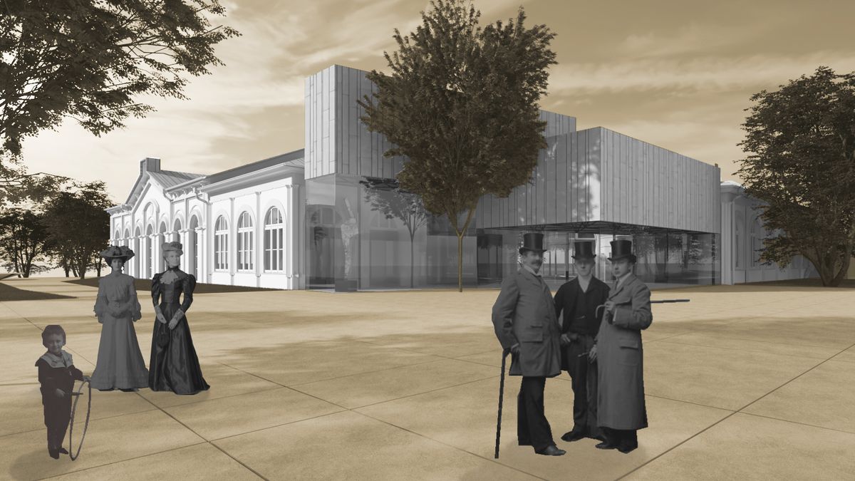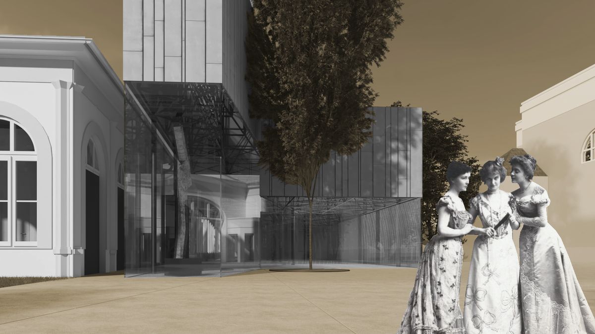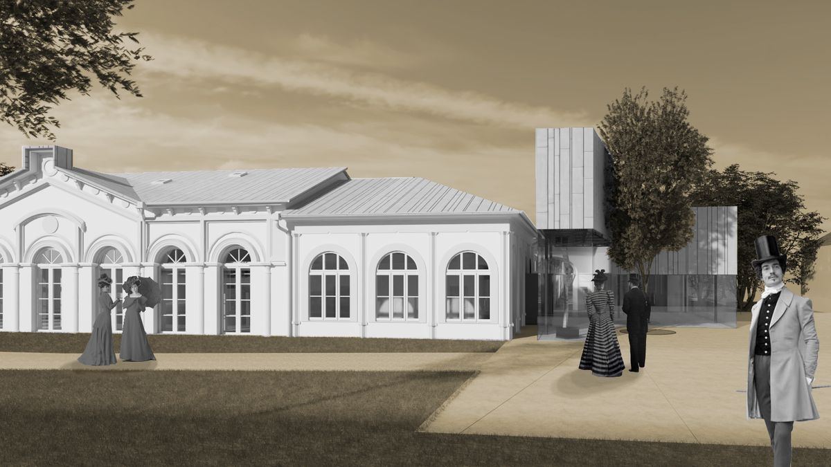 Klíčovou novinkou je malý vstupní pavilon, inspirovaný architekturou lázeňských pramenů a kolonád. Ten napraví letitou provozní slabinu areálu — nabídne velkorysé společné entrée, které obě budovy komfortně propojí a umožní oddělení provozu restaurace a sálu. Moderní přístavba s velkoformátovým bezrámovým zasklením bude záměrně působit, že se nedotýká původních objektů, aby bylo jasně patrné, co je historické a co současné.