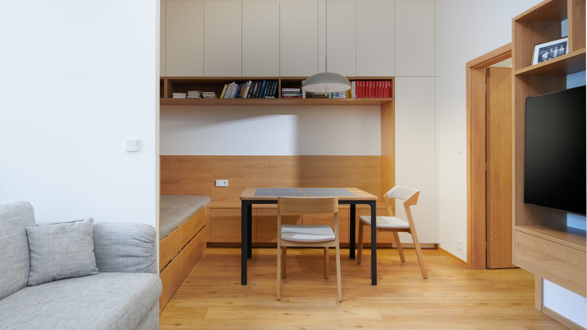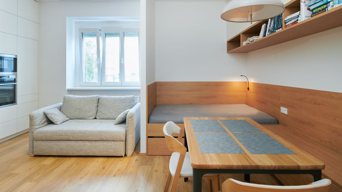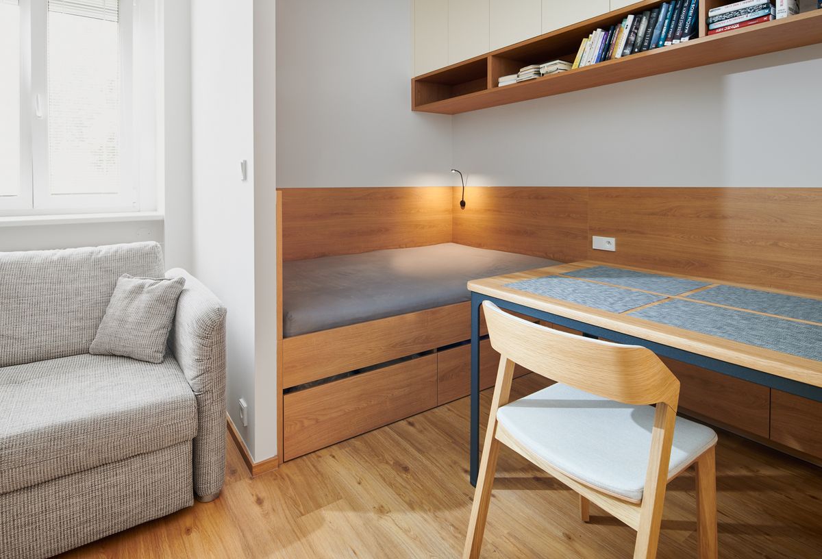 Spací zóna je oddělená příčkou, která poskytuje soukromí, aniž by zbytečně uzavírala prostor. Jídelní stůl navazuje na nábytkovou sestavu od postele a část skříněk zde slouží také jako lavice.