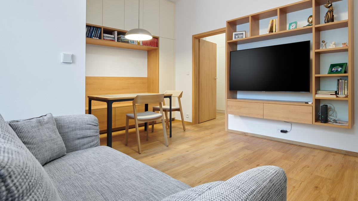 Hlavní obytná místnost kombinuje kuchyňský kout podél jedné stěny, kde sahá až ke stropu, čímž nabízí dostatek úložného prostoru, aniž by působil těžkopádně. Pod oknem se nachází menší sedací souprava, zatímco na nosné stěně je umístěna televize. Požadavek klientky vidět na obrazovku z kuchyně, od jídelního stolu, sedačky i z postele je vyřešen otočným držákem.