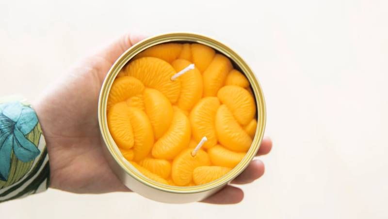 Interiér doladí svíčka vypadající jako konzerva mandarinek.