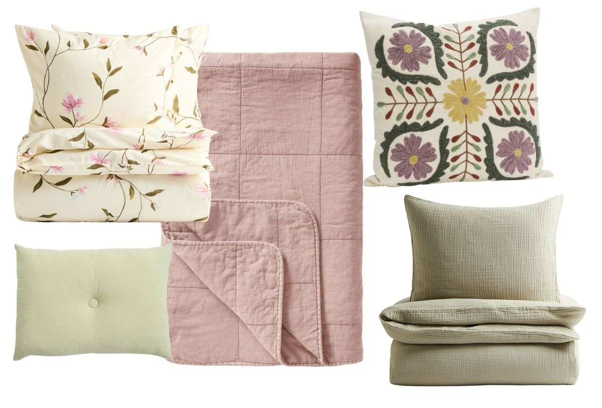 Povlečení nalevo, H&M Home 1349 Kč. Zelený polštář, Salted Home 2220 Kč. Růžový přehoz, Bella Rose 3029 Kč. Vyšívaný polštář, Bella Rose 1144 Kč. Mušelínové povlečení, H&M Home 1239 Kč.