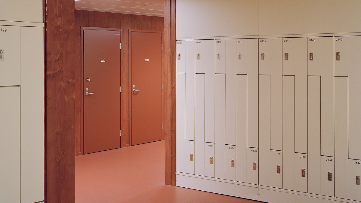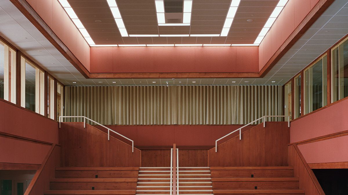 Barevné schéma plynule pokračuje od exteriéru k interiéru, ve kterém architekti zvolili velkorysé použití dřeva – z něhož je velká část mořena právě červenou až narezlou barvou. Díky tomu stavba působí jednotným dojmem zvenku i zevnitř.