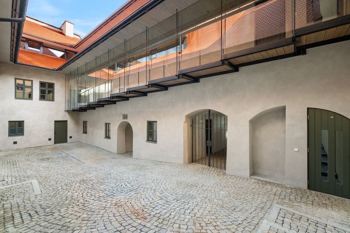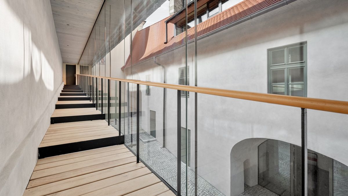 Vzhledem k různým výškovým úrovním musely být na pavlači instalovány vyrovnávací schody. Ty se rozprostřely po celé její délce i šířce jako takzvané koňské schody. Prostor pavlače je nevytápěný, a tak bylo možné navrhnout pavlač subtilní, s prosklením, a nechat tak kontrastně vyznít zemitosti původního historického domu.