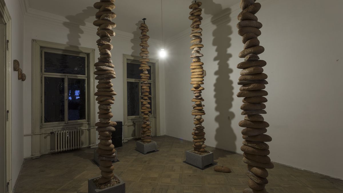 V dalším pokoji vytvořili studenti z Pedagogické fakulty Univerzity Hradec Králové tři vysoké sloupy postavené z bochníků chleba.
