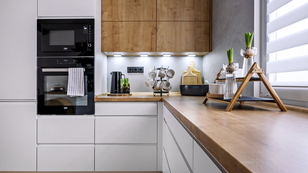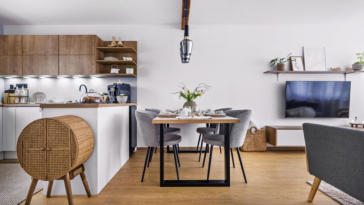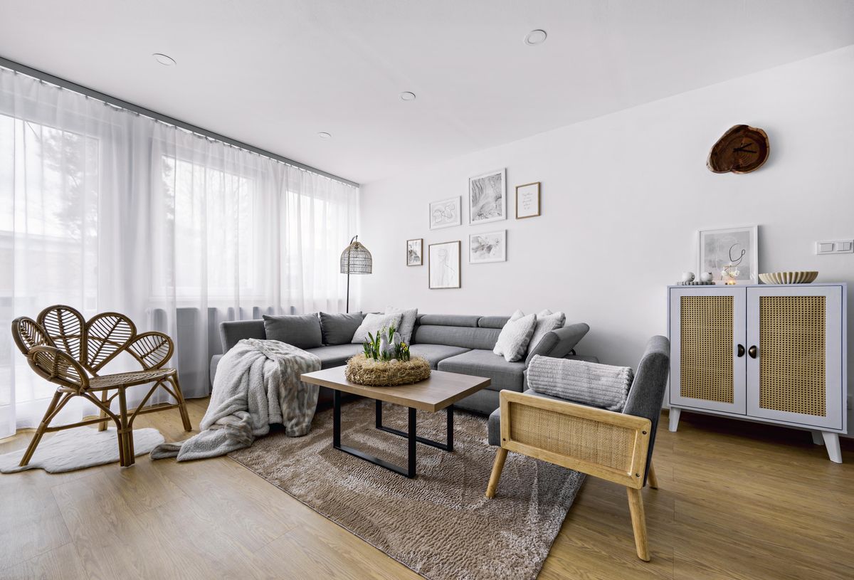 Při hledání stylu vsadila Michaela na světlé barvy, které vnášejí do interiéru svěžest, a dále na dřevo, jež mu dodává pocit tepla a útulna. Do hlavní obytné místnosti si sama navrhla kuchyň a TV stolek, které zhotovil truhlář. Jako kombinaci zvolila lamino v dekoru dub Hamilton s alpskou bílou barvou v matném provedení.
