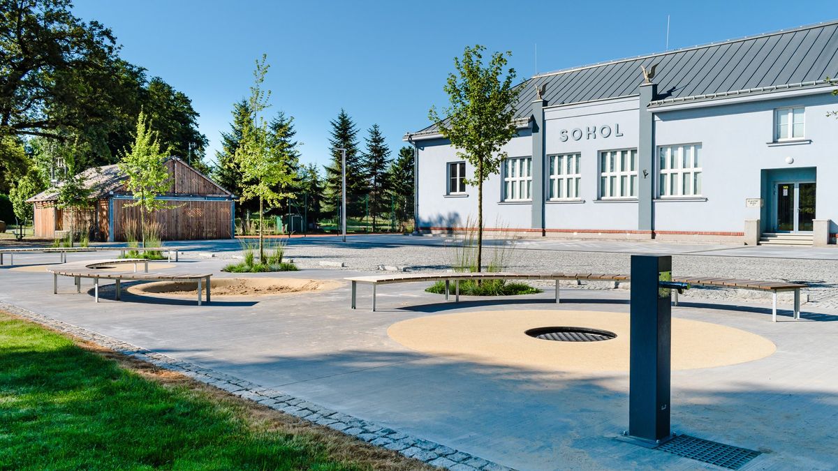 Před sokolovnou jsou jako stínění v linii vysázeny javory babyka. Potok Příšovka se díky úpravě koryta a zpřístupnění kamennými schody stal plnohodnotnou součástí nového veřejného prostoru.